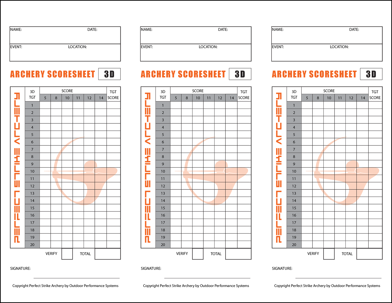 - PDF PRINT DOWNLOAD : Perfect Strike Archery Scoresheet. Secure PDF print file download. 3 game records per sheet.