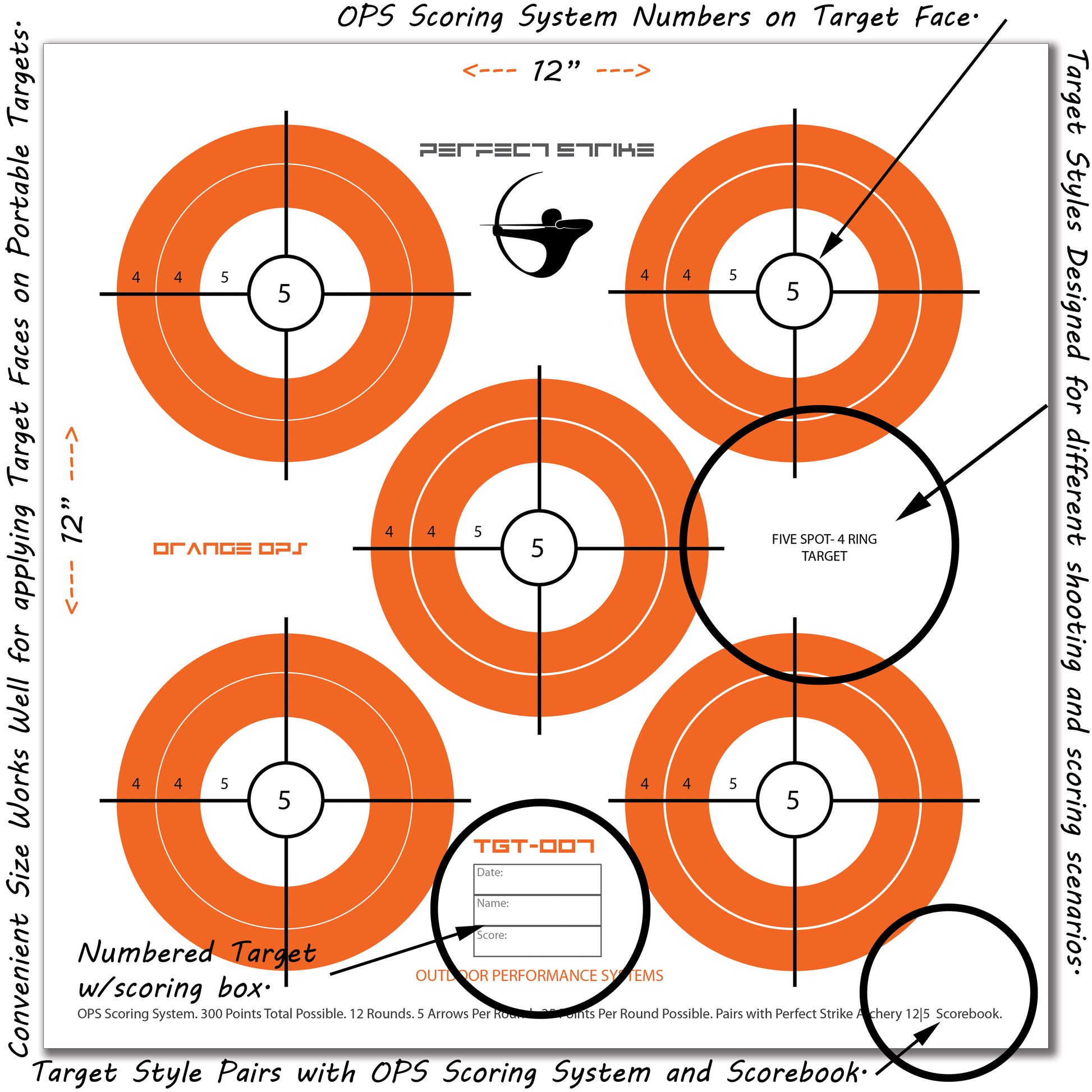 Perfect Strike ARCHERY System Targets. ORANGE OPS No. 007. Five Spot Targets. 12" x 12".