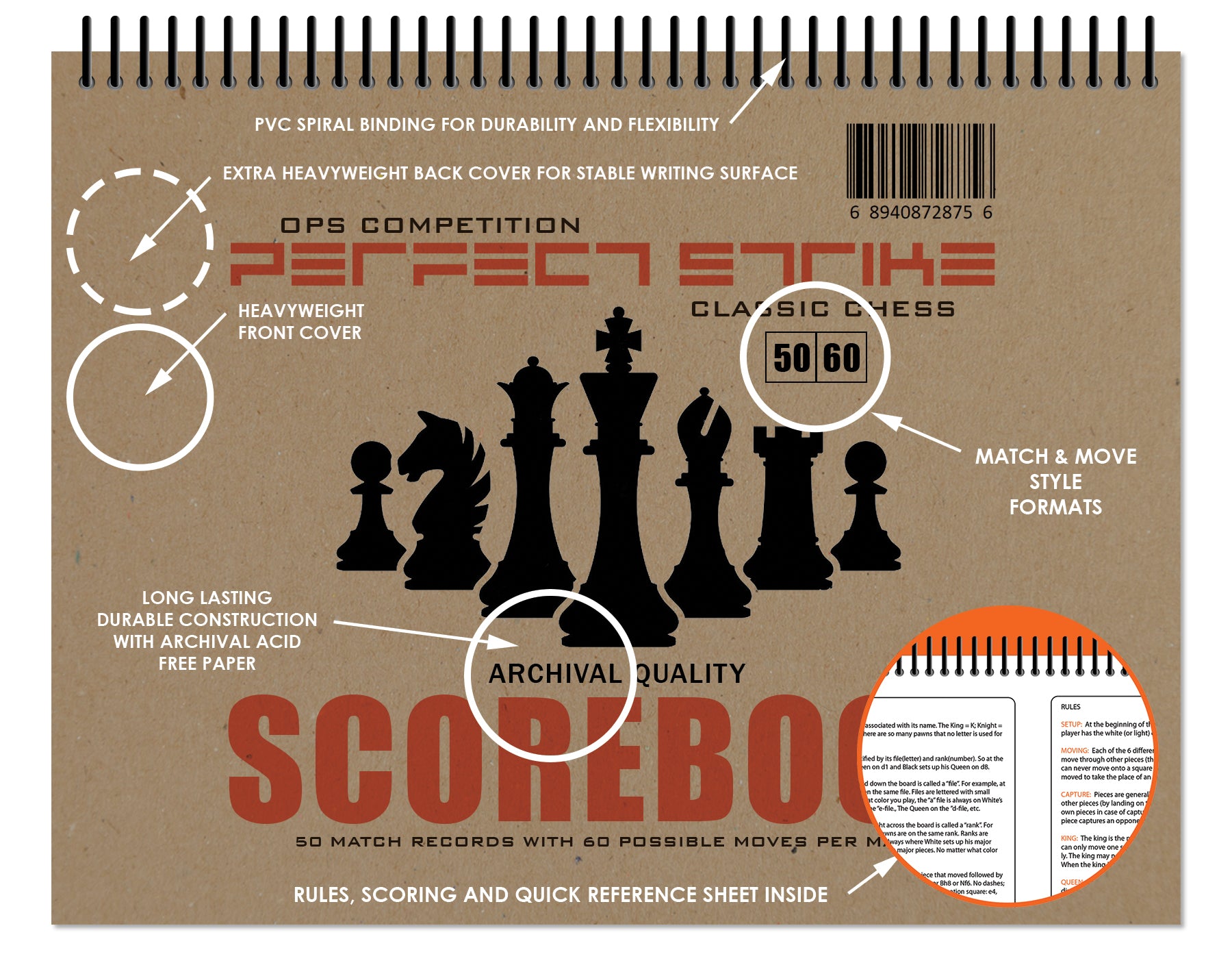 - CHESS SCOREBOOK : Perfect Strike archival quality, heavy duty chess scorebook. Convenient size for scoring chess games and matches. 8.5" x 11". 50 Games records per book. 60 possible chess moves per game. Classic score book design, improved for easier recognition. Included with the chess score book are sheets for Rules, Scoring and Board Positioning.