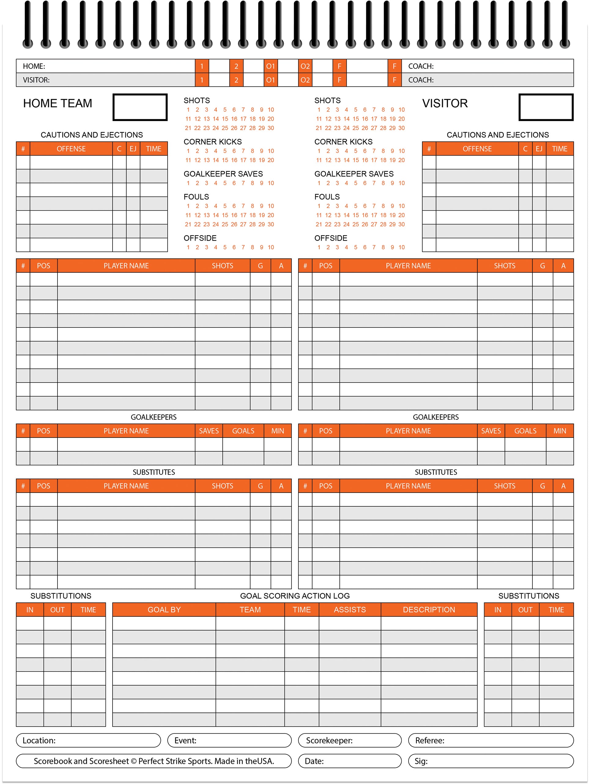 - SOCCER SCOREBOOK - Perfect Strike high quality, heavy duty soccer scorebook. Soccer score keeping. 8.5" x 11", 40 scoring records on 20 heavy paper sheets. 11 Player plus substitutions. USL, MSL, NCAA, NWSL, HIGH SCHOOL and youth soccer.