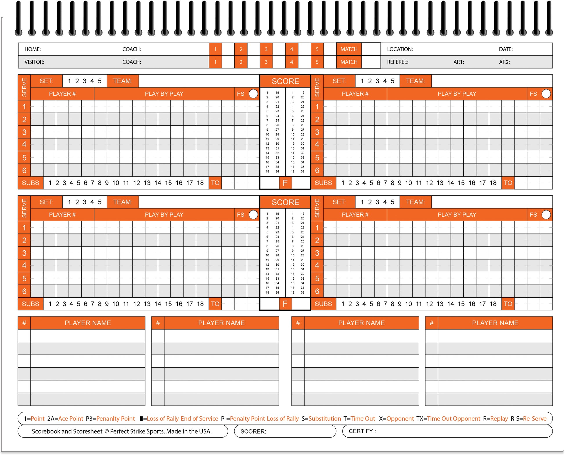 - VOLLEYBALL SCOREBOOK - Perfect Strike high quality, heavy duty volleyball scorebook. Volleyball score keeping. 8.5" x 11", 40 scoring records on 20 heavy paper sheets. 12 Player. Professional, NCAA, HIGH SCHOOL and youth volleyball.